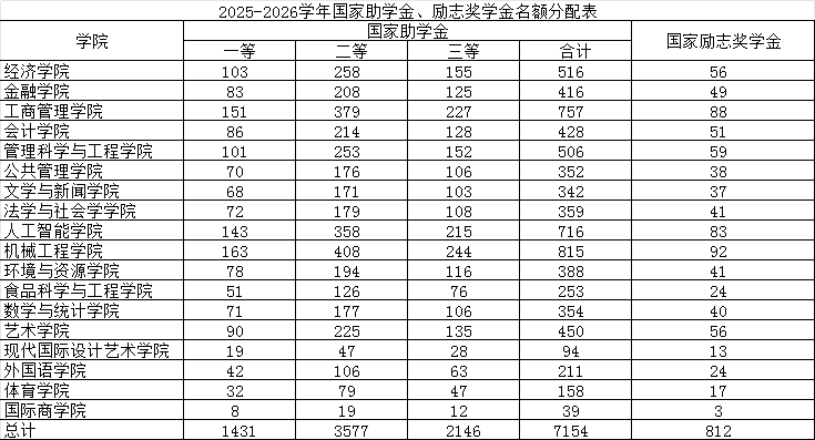 当前位置: 首页 >> 通知 >> 正文 关于开展2025-2026学年国家励志奖学金、国家助学金评选工作的通知 时间:2025年10月11日 17:48 作者: 白文静 各学院: 根据《重庆市教育委员会关于下达2025—2026学年市属高校国家资助名额的通知》和《重庆工商大学2025-2026学年国家奖助学金评审工作实施方案》,决定启动我校2025-2026学年国家励志奖学金、国家助学金评选工作。现将有关事项通知如下: 一、参评对象 (一)国家励志奖学金:本学年被评定为家庭经济困难的全日制本科二年级以上的学生且学习成绩等条件达到相关要求。 (二)国家助学金:本学年被评定为家庭经济困难的全日制本科学生。 二、名额分配 本学年重庆市教委下达到我校国家励志奖学金名额812名,国家助学金名额7154名(其中一等助学金1431名、二等助学金3577名,三等助学金2146名),各学院名额按以下原则进行分配: (1) 国家励志奖学金:根据学院本学年认定的本科二年级以上(含二年级)家庭经济困难学生人数占全校本学年认定的本科二年级以上(含二年级)家庭经济困难学生总人数的比例进行分配。 (2) 国家助学金:根据学院本学年认定的本科家庭经济困难学生人数占全校本学年认定的本科家庭经济困难学生总人数的比例进行分配。 各学院具体分配名额如下: 三、申请条件及申请流程 详见2025年版学生手册中《重庆工商大学国家励志奖学金、国家助学金评审办法》。 四、相关要求 (一)各学院可根据学校评审办法的相关规定结合学院实际情况制定相应的评选细则,认真做好国家励志奖学金、国家助学金的评选工作。 (二)各学院高度重视,广泛宣传,公平、公正、公开、民主评选,认真审核学生提交的申请信息,确保最符合条件的学生获得奖励或资助,切实发挥国家励志奖学金、国家助学金“奖优”和“帮困”的积极作用,让广大学生充分感受到党和国家的关爱和厚望,促进他们努力学习、奋发成才。 (三)若学院申请人数少于学校下达到学院的名额,应及时将多余名额退回到学生资助管理中心,由学生资助管理中心将多余名额在全校范围内进行二次分配。 (四)各学院要重点关注特殊困难群体学生的评选情况,原则上特殊困难群体学生均应获得国家助学金,其中脱贫家庭学生、脱贫不稳定家庭学生获二等及以上助学金,学生本人放弃申请的要写放弃说明并签字,相关材料由学院自行保存备查。退伍学生享受专项资助,原则上不参与国家助学金的评选。 (五)各学院要重点核查申请学生的受处分情况,受学校警告及以上处分且还在处分影响期内的不得评选,若在资助资金发放过程中受校级警告及以上处分的要立即上报学生资助管理中心取消其受资助资格并停止助学金发放。 (六)学院要积极做好受资助学生的监督工作,若学生在获得资助后,发现其生活有铺张浪费、奢侈消费行为,例如频繁出入高端消费场所、购买高档化妆品、多次旅游等行为的要及时上报学生资助管理中心停止资助并对其进行批评教育。 五、上报材料及时间要求 本年度国家励志奖学金和国家助学金通过学工系统中学生资助-国家资助模块进行线上申请,初审名单汇总表(附件2和附件4)电子版10月18日前发给学生资助管理中心,10月20日前各学院完成线上申请审核工作。 附件1:本专科生国家励志奖学金申请表 附件2:2024-2025学年国家励志奖学金获奖学生初审名单表 附件3:本专科生国家助学金申请表 附件4:2025-2026学年国家助学金学金获奖学生初审名单表 学生处 2025年10月11日 附件【附件1:本专科生国家励志奖学金申请表.docx】已下载次 附件【附件2:2024-2025学年国家励志奖学金获奖学生初审名单表.xls】已下载次 附件【附件3:本专科生国家助学金申请表.docx】已下载次 附件【附件4:2025-2026学年国家助学金学金获奖学生初审名单表.xls】已下载次 上一条:关于做好2025级“女子升大计划”项目受助学生推荐工作的通知 下一条:关于做好2025-2026学年学生学业规划工作的通知 【关闭】