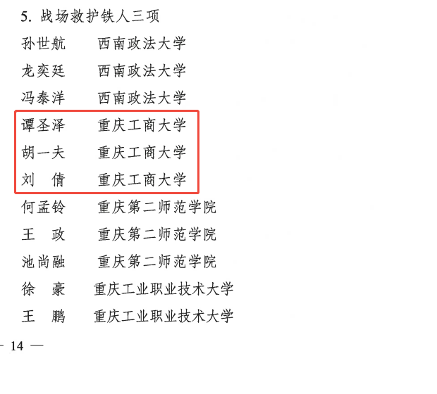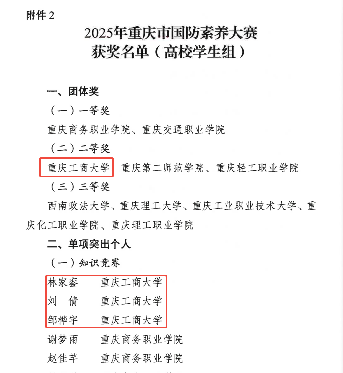 当前位置: 首页 >> 学工新闻 >> 正文 学校在 2025 年重庆市国防素养大赛中斩获佳绩 彰显青年国防担当 时间:2025年10月27日 17:21 作者: 周良勇 近日,中共重庆市委宣传部发文表扬在“筑梦国防・强国有我”2025 年重庆市国防素养大赛中取得佳绩的单位和个人。我校学子凭借扎实的国防知识、顽强的拼搏精神和出色的团队协作,在高校学生组竞赛中表现亮眼,斩获团体二等奖,5名学生获评单项突出个人。 以赛促学,国防知识筑牢思想根基 在单项突出个人评选中,学校学子在知识竞赛和战场救护铁人三项两个项目中多点开花。知识竞赛环节,林家銮、刘倩、邹桦宇三位同学凭借丰富的国防知识储备和快速反应能力脱颖而出,获评单项突出个人。他们在赛前系统研习国防理论、军事常识和时事热点,竞赛中沉着应答、精准作答,展现了对国防知识的深刻理解。 战场救护铁人三项赛场上,谭圣泽、胡一夫、刘倩三位同学密切配合,熟练完成战地急救、物资转运等实操任务,以规范的操作流程和高效的协作能力以满分的成绩获评单项突出个人。他们将日常所学的急救知识与军事技能相结合,在模拟战场环境中展现出过硬的应急处置能力,彰显了当代大学生的责任与担当。 凝心聚力,团队协作斩获团体殊荣 本次大赛高校学生组团体赛竞争激烈。我校参赛团队由武装部统筹组织,选拔各学院优秀学子组成,赛前经过了系统的国防知识培训、军事技能训练和团队协作磨合。 比赛中,团队成员在各个环节相互支持、默契配合,既展现了单兵作战的过硬素质,又彰显了集体攻坚的强大合力。最终,凭借在各项赛项中的稳定发挥,成功斩获高校学生组团体二等奖,为学校赢得了荣誉。 以赛育人,国防教育赋能成长之路 重庆工商大学始终高度重视全民国防教育工作,将国防教育融入人才培养全过程,通过开设军事理论课程、开展军事训练、组织国防主题实践活动等多种形式,厚植学生爱国情怀,提升学生国防素养。 此次参赛不仅为学生提供了锤炼本领、展示风采的平台,更以赛促学、以赛促练,进一步激发了全校师生关心国防、热爱国防、建设国防、保卫国防的思想共识和自觉行动。学校将以此次获奖为契机,持续深化国防教育改革创新,丰富教育内容载体,着力培养更多兼具家国情怀与综合素质的新时代青年,为强国建设、国防强大贡献工商力量。 上一条:校地联建聚合力 双向赋能促振兴——机关党委学生工作部党支部赴忠县开展主题党日活动 下一条:重庆工商大学举行2025年秋季退伍学生欢迎会 【关闭】