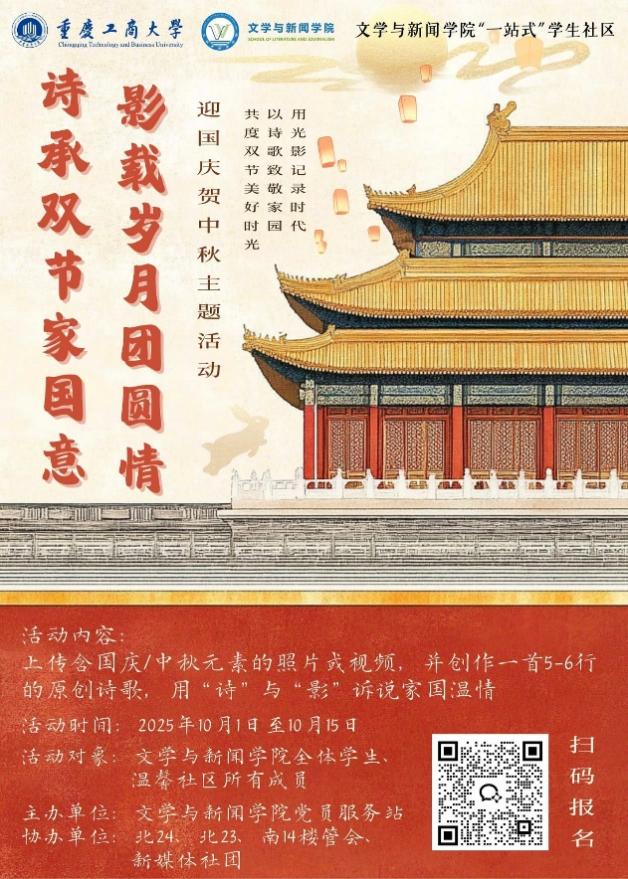 当前位置: 首页 >> 社区建设 >> 正文 诗影诉家国 文思展情怀——文学与新闻学院“一站式”学生社区“诗影双节”主题活动圆满落幕 时间:2025年10月16日 11:26 作者: 文学与新闻学院 为迎接国庆、中秋双节,深化青年学子家国情怀教育,10月1日至15日,由文学与新闻学院党员服务站主办、北24楼管会协办的“诗承双节家国意,影载岁月团圆情”主题活动圆满完成。活动以“诗影联动”为特色,吸引学生踊跃参与,用镜头定格团圆瞬间,以诗行传递家国深情。 本次活动聚焦“双节交融”核心主题,对作品形式作出创新设计。参与者需提交3-5张创意摄影或30-60秒短视频,捕捉节日场景、家国风貌等元素;诗歌投稿需紧扣影像内容创作5-6行原创诗作。活动自启动以来,文新学子及相关楼栋学生积极响应,创作热情高涨。 从投稿作品来看,内容丰富、亮点纷呈,既有“国旗与明月同框”的校园景致,展现双节同庆的独特氛围;也有家人围坐共话家国的温馨瞬间,传递亲情与爱国情的交融;更有以校园地标为背景、融入时代元素的创意表达,体现青年学子的巧思与担当。学生们用细腻的镜头语言定格美好,以凝练的诗句诠释“家国同心”的内涵,作品整体风格积极向上,兼具思想性与艺术性。 据了解,活动共收集视频作品5个、照片作品220张,评选出一等奖2名、二等奖4名、三等奖8名及优秀奖8名。此次活动将思政教育与传统节日文化实践有机结合,不仅为学生搭建了展现创意与才华的平台,更引导青年学子在创作与分享中,深刻感知国庆的家国荣光与中秋的阖家团圆,进一步激发爱国情怀和文化自信。 下一步,文学与新闻学院将持续探索节日文化与思政教育结合的新路径,推出更多贴近学生生活、符合青年特点的活动,推动家国情怀教育走深走实,引导青年学生在潜移默化中传承文化基因,增强时代担当。 上一条:聚焦考研核心需求!CTBU“小伙伴计划”专题讲座为150余名学子赋能! 下一条:镜头映国韵,青春诉赤诚——会计学院红岩党员服务站开展国庆打卡主题活动 【关闭】
