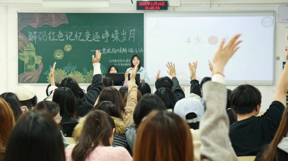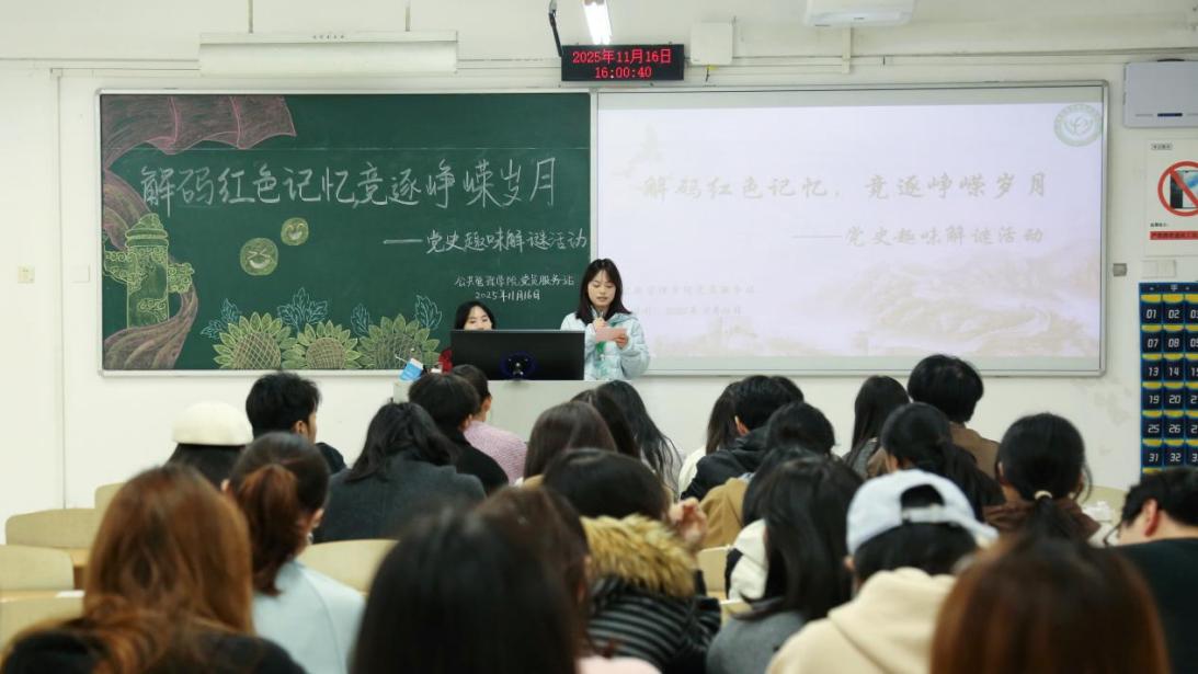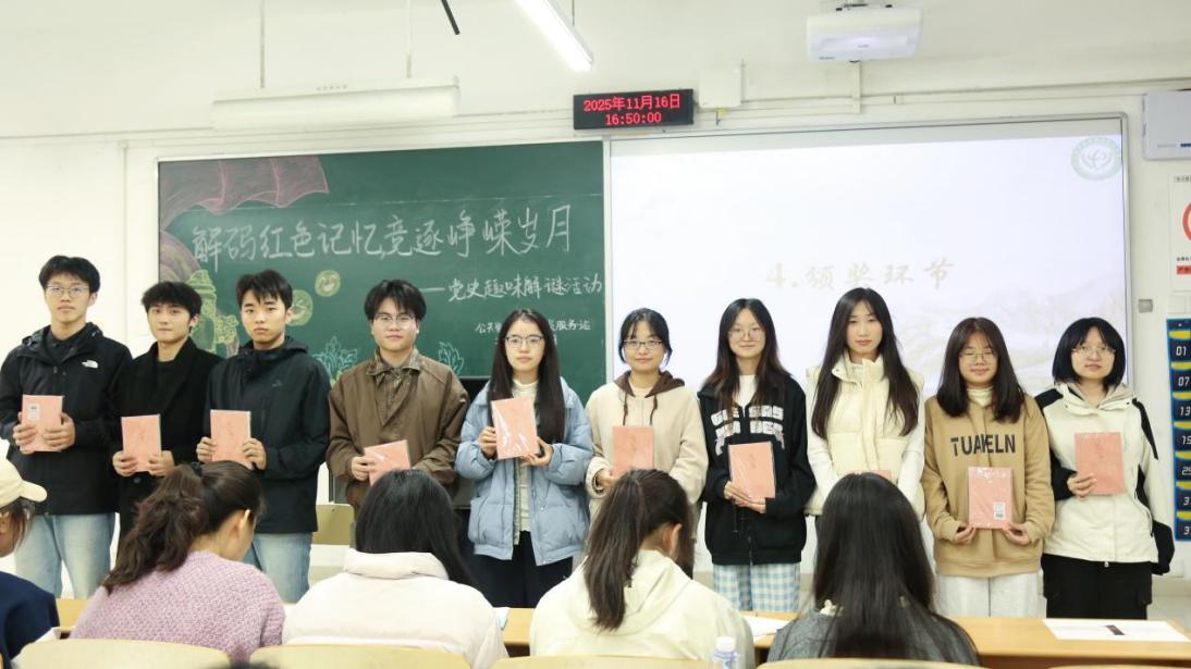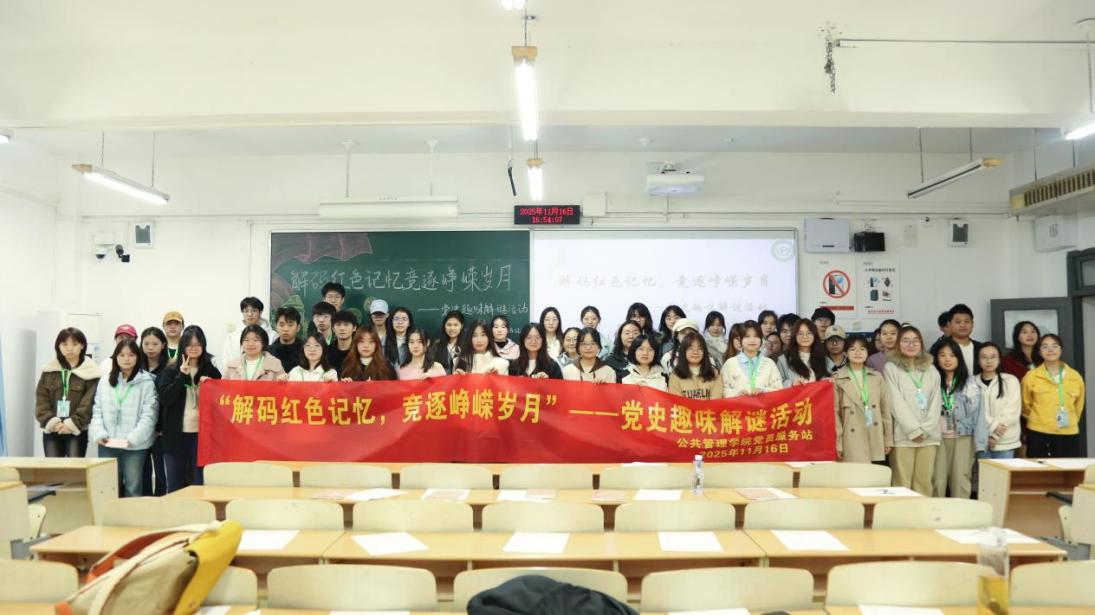 当前位置: 首页 >> 社区建设 >> 正文 “解码红色记忆,竞逐峥嵘岁月”——公共管理学院共学社区党员服务站举办党史趣味解谜活动 时间:2025年11月17日 17:08 作者: 公共管理学院党员服务站 为引导青年学生主动学习党史知识、提升思想政治素养,2025年11月16日,公共管理学院共学社区党员服务站于南岸校区博智楼07204教室开展了“解码红色记忆,竞逐峥嵘岁月”——党史趣味解谜活动,共计61人参与。活动旨在以互动形式引导参与者们主动传承红色基因,切实筑牢理想信念之基。 活动伊始,同学们在工作人员的引导下有序签到并按分组就坐。主持人张星雨介绍了活动背景、活动流程及计分标准后,活动便进入了“emoji猜历史”猜图环节。大家根据给出的emoji图案猜测历史事件,抢答氛围热烈而有序。紧接着是“破译摩斯密码”破密环节。参与者们在主持人的演示后,开始破译摩斯密码,并进行抢答。随后,工作人员统计出两个环节积分累计靠前的两组登台领取奖品并合影留念。活动尾声,主持人总结各环节亮点,鼓励同学们将红色精神转化为奋进动力。最后,全体参与者合影留念并有序签退,活动顺利落下帷幕。 本次活动依托“共学社区·铸魂工程”平台,创新采用互动形式,实现了党史学习从“单向灌输”到“双向互动”的转变,通过组内协作、组间PK的竞技模式,有效强化了学子的集体凝聚力。公共管理学院共学社区党员服务站将持续深化共学社区的建设,让先辈初心在青春岁月中绵延流淌,让信仰力量在青年心中深深扎根。 上一条:“心”系学子,“行”践担当——公共管理学院“一站式”学生社区多维赋能学生成长 下一条:“薪火相随寻路去,欢笑同行筑梦来”——环境与资源学院成功举办红色趣味游园会 【关闭】