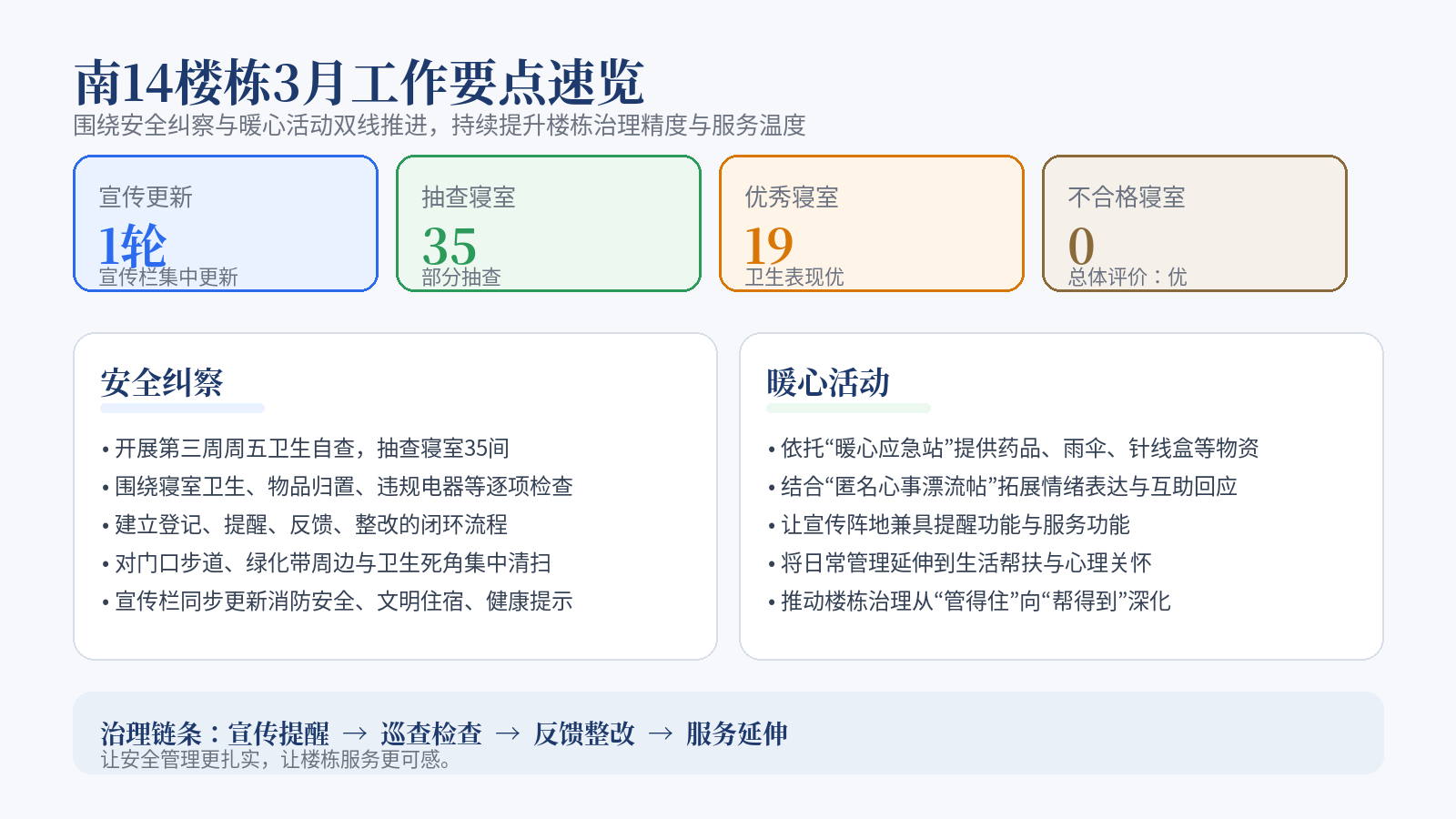 当前位置: 首页 >> 社区建设 >> 正文 纠察筑防线,活动聚暖意——南14楼管会开展社区建设纪实 时间:2026年03月31日 11:23 作者: 文学与新闻学院南14楼管会 三月以来,南14楼管会围绕“一站式”学生社区建设要求,以安全纠察守牢工作底线,以服务活动为抓手,持续推进楼栋治理与育人工作同向发力。从宣传更新、卫生自查到隐患排查、暖心服务,南14正以更细、更实、更暖的日常行动,推动楼栋环境更整洁、秩序更稳定、氛围更向上,也让楼栋管理逐步从基础维持走向品质提升。 安全纠察始终是南14楼栋治理的重点环节。楼管会坚持“日常巡查+重点检查+即时反馈”的工作机制,结合第三周周五卫生自查,对文学与新闻学院35间寝室开展抽查,评出优秀寝室19间,不合格寝室0间,总体评价为“优”。检查过程中,成员围绕寝室卫生、物品归置、违规电器、通道堆物等情况逐项查看,同步做好登记、提醒、反馈,推动问题发现、整改落实、复查销号形成闭环。与此同时,楼管会还对门口步道、绿化带周边和公共区域卫生死角进行集中清扫,通过“查寝、查隐患、查环境”一体推进,让安全管理从寝室内部延伸到楼栋周边,进一步织密楼栋安全防线。宣传栏同步更新消防安全、文明住宿和健康提示内容,也让安全教育从一次检查延伸为日常提醒。 在做好纠察工作的同时,南14也注重以活动增强服务温度。围绕同学实际需求,楼管会持续推进宣传阵地建设与楼栋特色服务探索,让宣传栏既有提醒功能,也有服务功能。结合现有工作思路,南14依托“暖心应急站”“匿名心事漂流帖”等服务载体,把日常管理延伸到生活帮扶与情绪关怀之中。前者聚焦药品、雨伞、针线盒等应急物资供给,后者为同学提供匿名表达、互助回应的平台,推动楼栋治理由“管得住”向“帮得到”进一步深化,也让同学在被管理之外,切实感受到被关注、被支持、被理解。 从安全纠察到暖心活动,南14楼管会正在把“查”落到责任上,把“助”落到细节里,把“暖”落到同学日常体验中。下一步,楼管会将继续围绕安全排查、卫生维护、服务供给和文明建设常态发力,推动南14在守住安全底线的基础上,持续建设更有温度、更有秩序、更有凝聚力的学生社区。 下一条:数统楼管会三月活动纷呈 缤纷活动绘就寝室新蓝图 【关闭】